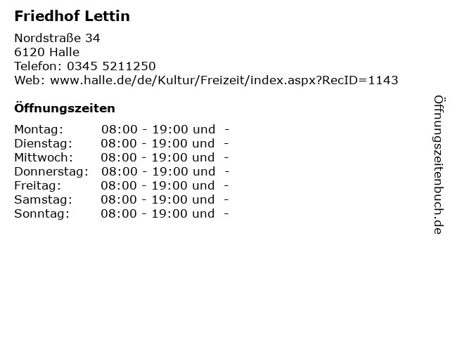 | Öffnungszeiten Friedhof Lettin in Halle anzeigen | |