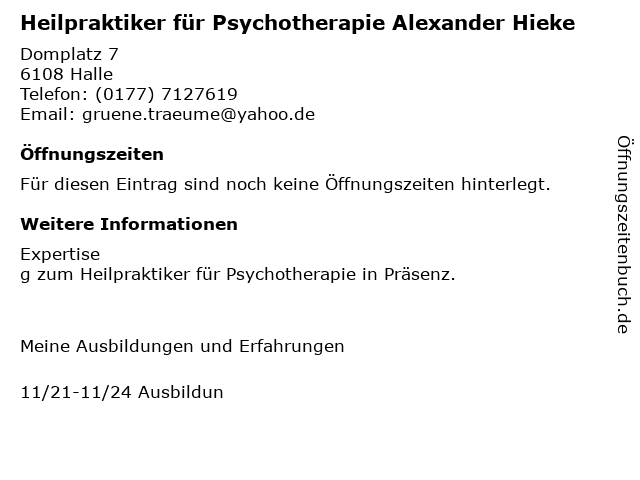 | Heilpraktiker für Psychotherapie Alexander Hieke anrufen | |
