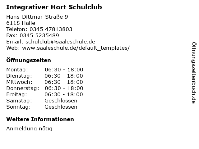 | Öffnungszeiten Integrativer Hort Schulclub in Halle anzeigen | |