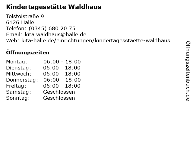 | Öffnungszeiten Kindertagesstätte Waldhaus in Halle anzeigen | |