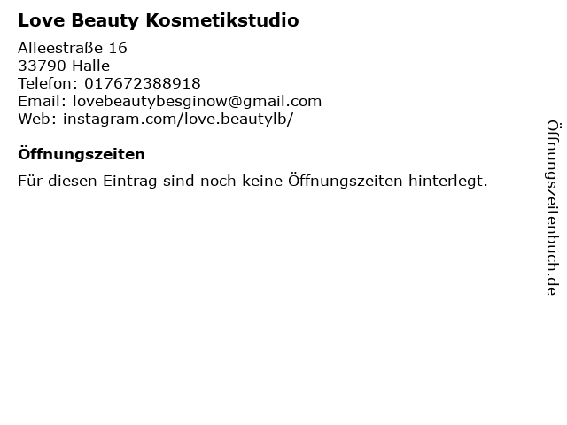 | Öffnungszeiten Love Beauty Kosmetikstudio in Halle anzeigen | |