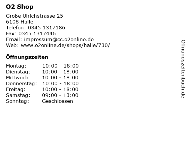 | Öffnungszeiten O2 Shop in Halle anzeigen | |