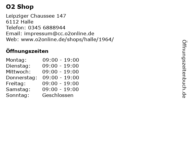 | Öffnungszeiten O2 Shop in Halle anzeigen | |