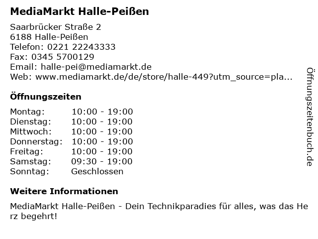 | Öffnungszeiten MediaMarkt Halle-Peißen in Halle-Peißen anzeigen | |