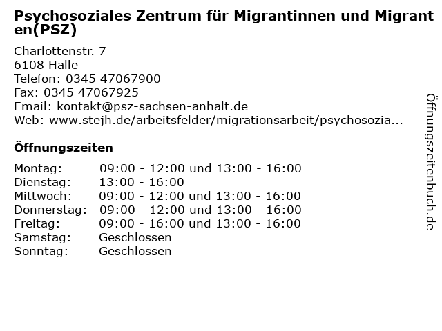 1 Beratungsstelle für Migranten in Halle/Saalekreis - Frau Keitel (Russisch, Englisch) (Entfernung: 0,98 km) Große Klausstraße 11, 06108 Halle 2 Beratungsstelle für Migranten in Halle/Saalekreis - Herr Amelal (Arabisch, Englisch) (Entfernung: 0,98 km) Große Klausstraße 11, 06108 Halle 3 Beratungsstelle für Migranten in Halle/Saalekreis - Herr Amelal (Arabisch, Englisch) (Entfernung: 14,21 km) Sixtistr. 16a, 06217 Merseburg 4 Psychosoziales Gemeindezentrum,TWSD in Sachsen Gmb (Entfernung: 28,55 km) Ringstraße 213, 04209 Leipzig 5 Psychosoziales Zentrum "Perlenfischer" der Alexianer Ambulanten Dienste (Entfernung: 28,55 km) Bismarckstraße 19, 06749 Bitterfeld-Wolfen 6 Städtischer Eigenbetrieb Behindertenhilfe Psychosoziales Gemeindezentrum Nordost (Entfernung: 31,92 km) Bochumer Str. 26, 04357 Leipzig |