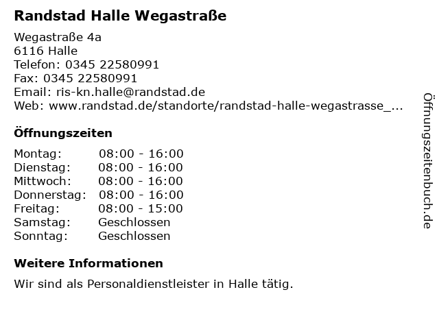 | Öffnungszeiten Randstad Halle Wegastraße in Halle anzeigen | |