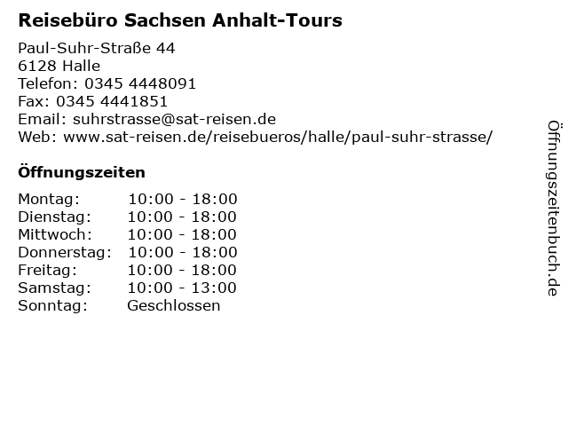 | Öffnungszeiten Reisebüro Sachsen Anhalt-Tours in Halle anzeigen | |