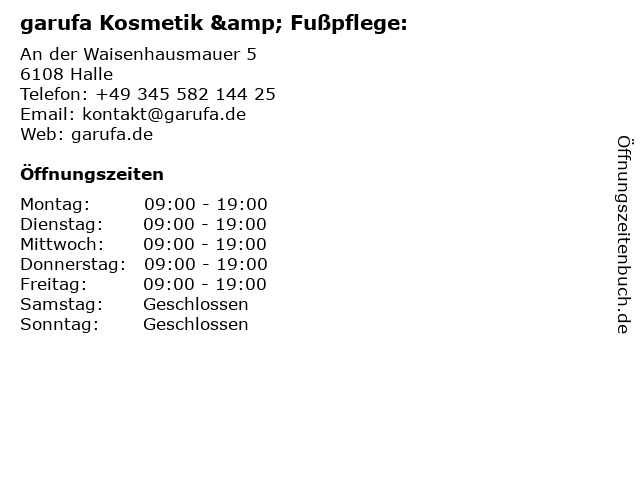 | Öffnungszeiten garufa Kosmetik & Fußpflege: in Halle anzeigen | |