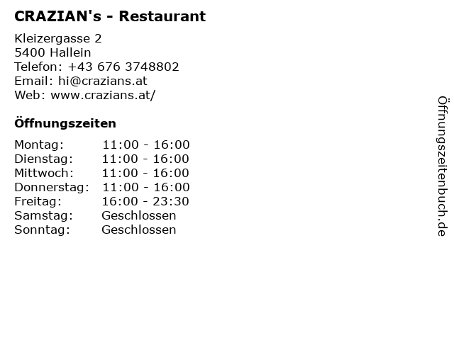 | Öffnungszeiten CRAZIAN's - Restaurant in Hallein anzeigen | |
