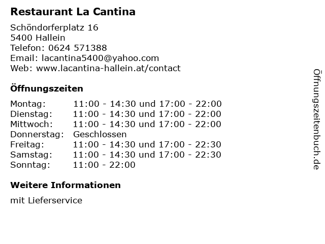 | Öffnungszeiten Restaurant La Cantina in Hallein anzeigen | |