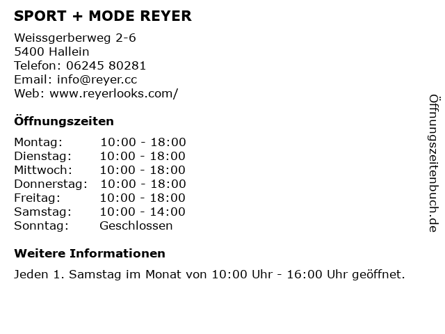| Öffnungszeiten SPORT + MODE REYER in Hallein anzeigen | |