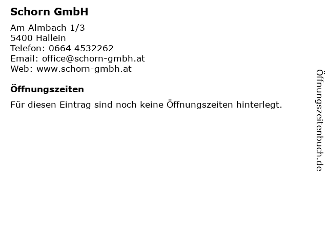 | Öffnungszeiten Schorn GmbH in Hallein anzeigen | |