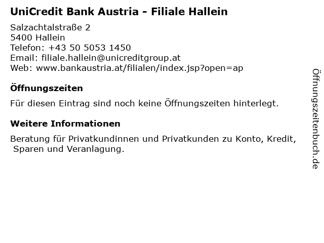 | UniCredit Bank Austria - Filiale Hallein anrufen | |