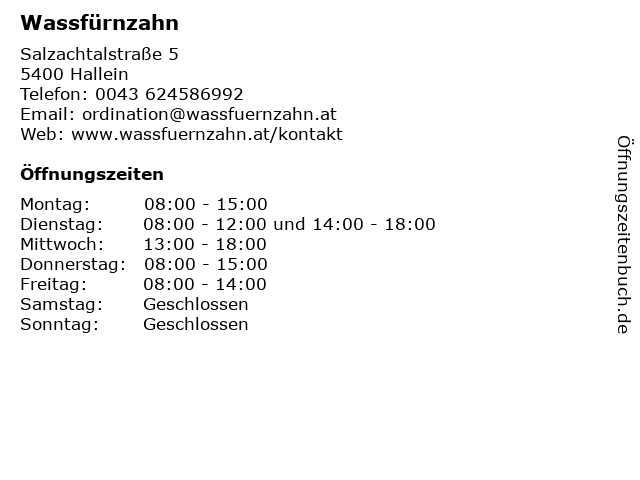 | Öffnungszeiten Wassfürnzahn in Hallein anzeigen | |