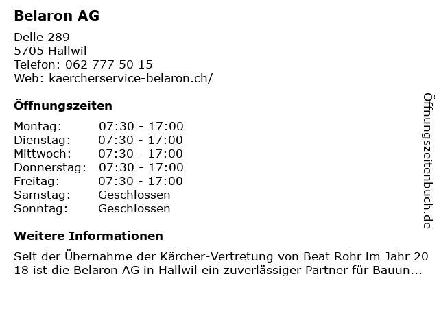 | Öffnungszeiten Belaron AG in Hallwil anzeigen | |