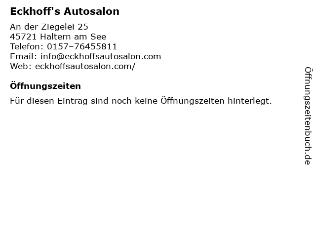 | Öffnungszeiten Eckhoff's Autosalon in Haltern am See anzeigen | |