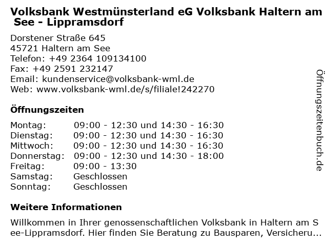 1 Volksbank Westmünsterland eG Volksbank Haltern am See (Entfernung: 7,30 km) Raiffeisenplatz 1, 45721 Haltern am See 2 Volksbank Westmünsterland eG Volksbank Haltern am See - Sythen (Entfernung: 11,04 km) Schalweg 9, 45721 Haltern am See 6 Geldautomat Volksbank Westmünsterland eG (Entfernung: 0,00 km) Dorstener Straße 645, 45721 Haltern am See |