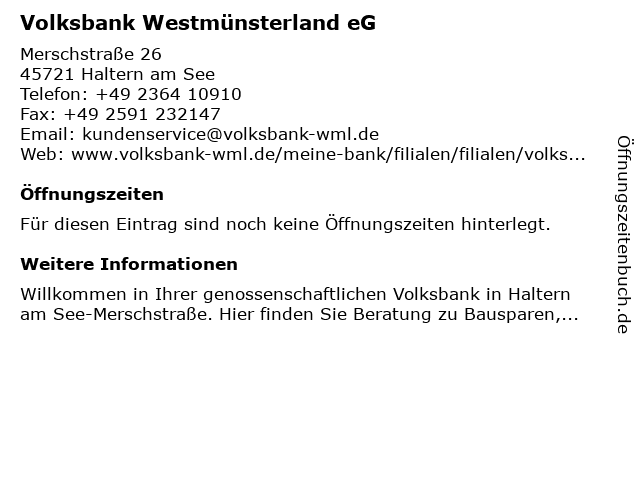 1 Volksbank Haltern eG - Filiale Merschstraße (Entfernung: 0,01 km) Merschstr. 26, 45721 Haltern am See 2 COMCAVE.COLLEGE Haltern am See, Merschstraße (Entfernung: 0,09 km) Merschstraße 7, 45721 Haltern am See 3 Kath. Kirchengemeinde St. Franziskus Pfarrbüro an der Liebfrauenkirche (Entfernung: 8,40 km) Neulandstr. 97, 45770 Marl 6 |