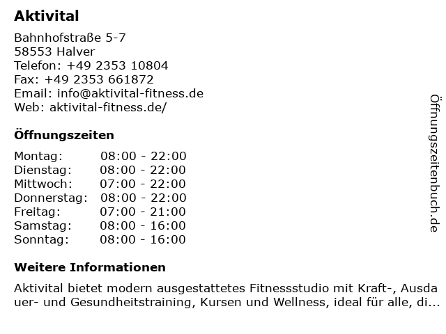 | Öffnungszeiten Aktivital in Halver anzeigen | |