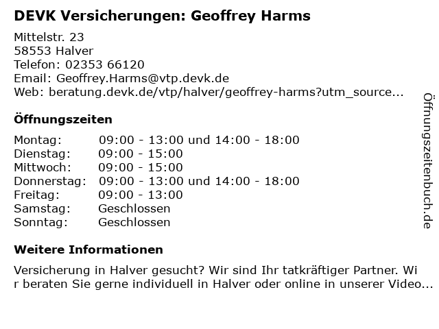 Branchen & Suchbegriffe zu DEVK Versicherungen: Geoffrey Harms:altersvorsorge, autoversicherung, berufsunfähigkeitsversicherung, devk, gebäude- und hausratsversicherung, geoffrey, gewerbeversicherung, harms, kfz-versicherung (motorrad), lebensversicherung, mietrechtsschutzversicherung, reiseversicherungsagentur, versicherungen |