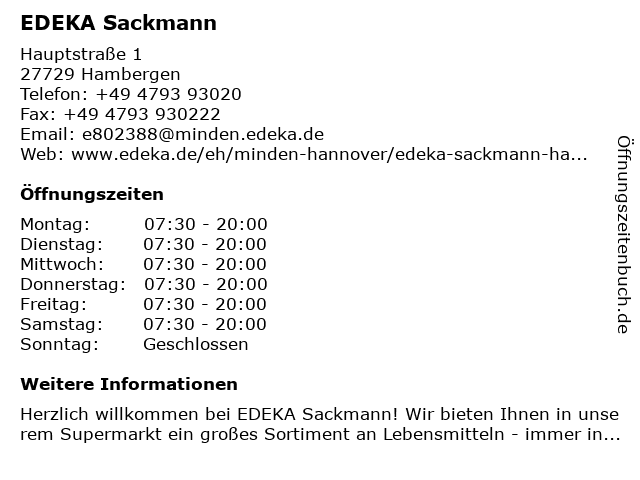 | Öffnungszeiten EDEKA Sackmann in Hambergen anzeigen | |