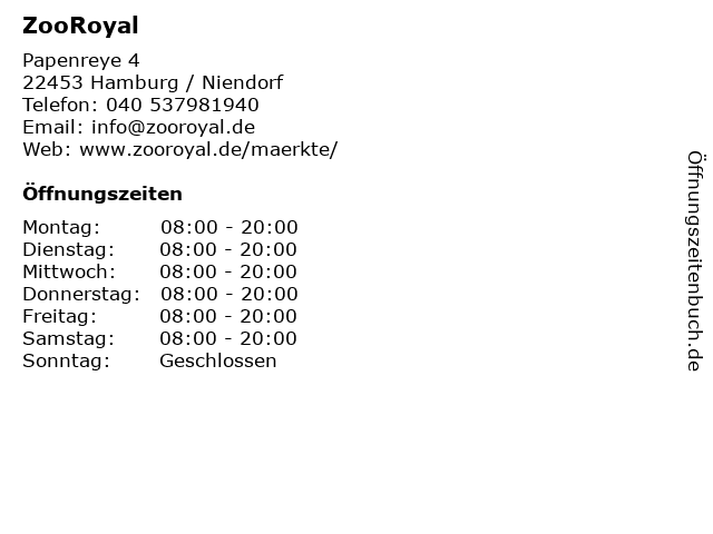 | Öffnungszeiten ZooRoyal in Hamburg / Niendorf anzeigen | |