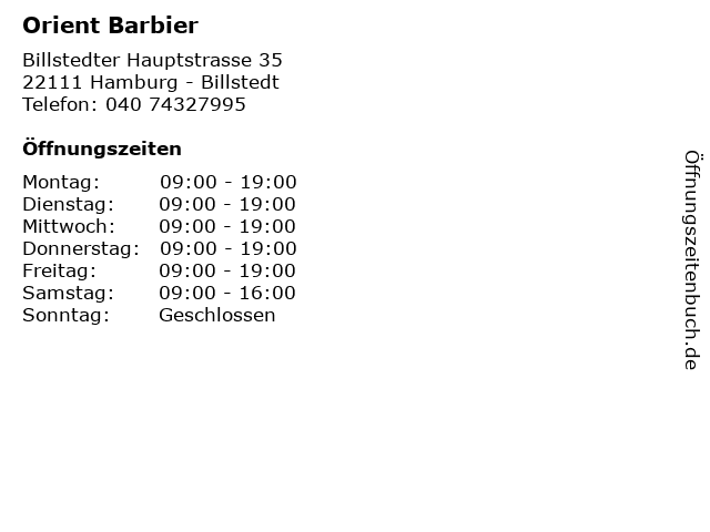 | Öffnungszeiten Orient Barbier in Hamburg - Billstedt anzeigen | |