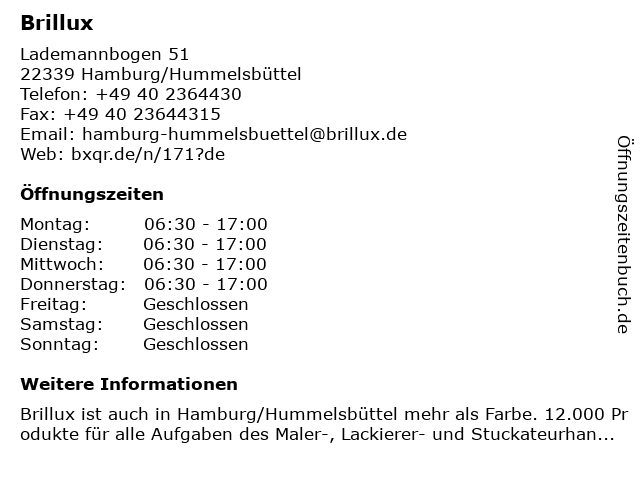 | Öffnungszeiten Brillux in Hamburg/Hummelsbüttel anzeigen | |