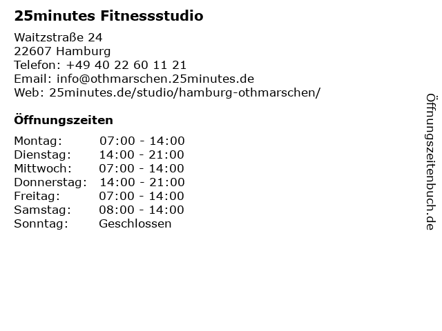 | Öffnungszeiten 25minutes Fitnessstudio in Hamburg anzeigen | |