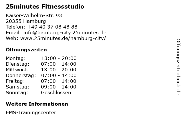 | Öffnungszeiten 25minutes Fitnessstudio in Hamburg anzeigen | |