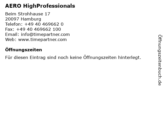 | Öffnungszeiten AERO HighProfessionals in Hamburg anzeigen | |