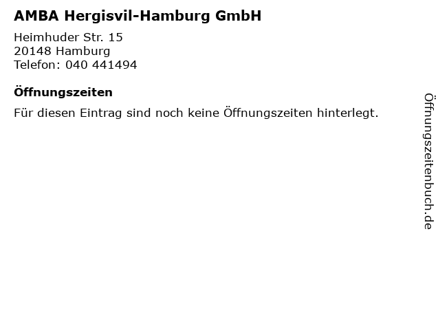 | Öffnungszeiten AMBA Hergisvil-Hamburg GmbH in Hamburg anzeigen | |