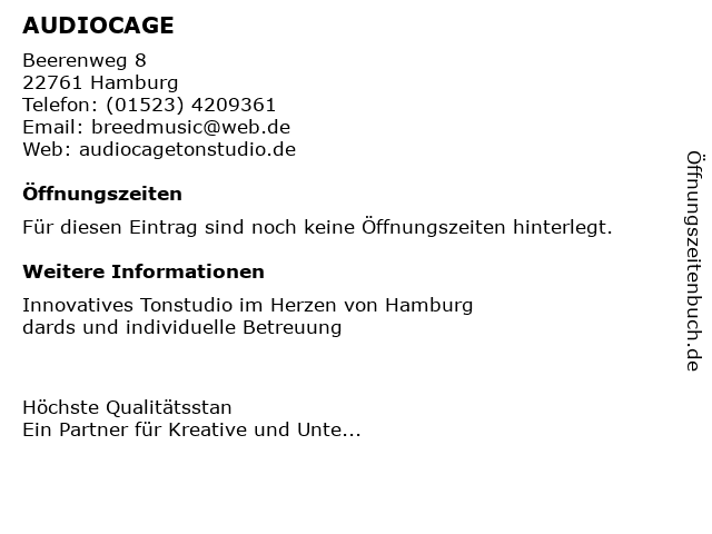 | Öffnungszeiten AUDIOCAGE in Hamburg anzeigen | |