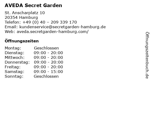 | Öffnungszeiten AVEDA Secret Garden in Hamburg anzeigen | |