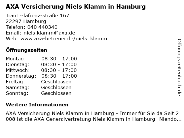 2 AXA Versicherung - Generalvertretung Oswald F. Groth (Entfernung: 1,93 km) Mexikoring 29, 22297 Hamburg 4 AXA Versicherung - Generalvertretung Johann Albers Versicherungen (Entfernung: 3,62 km) Rainweg 8, 20249 Hamburg 5 AXA Versicherung- Generalvertretung Holger Larsen (Entfernung: 3,95 km) Georg-Clasen-Weg 129, 22415 Hamburg 6 |