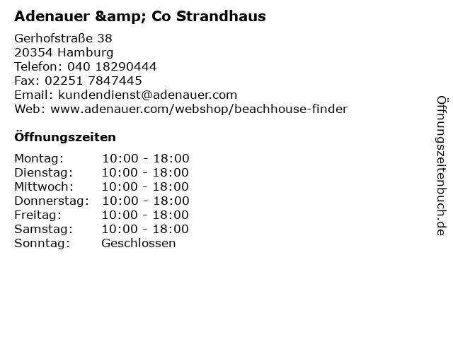 | Öffnungszeiten Adenauer & Co Strandhaus in Hamburg anzeigen | |