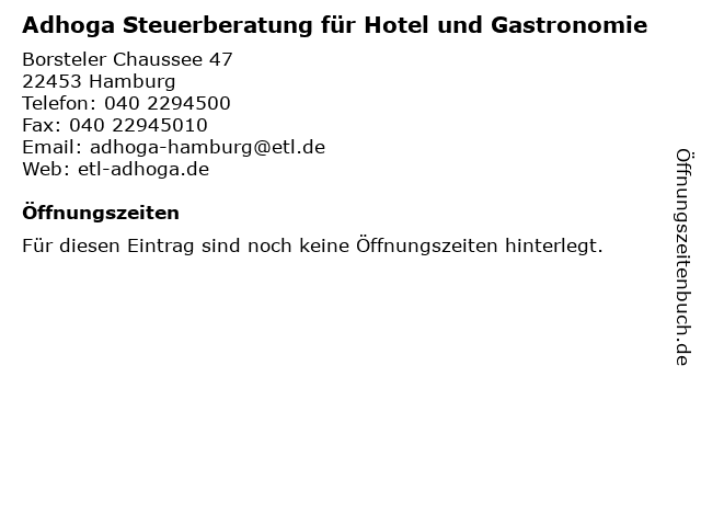 1 Adhoga Steuerberatung für Hotel und Gastronomie (Entfernung: 10,56 km) Rahlstedter Str. 14, 22149 Hamburg 6 |