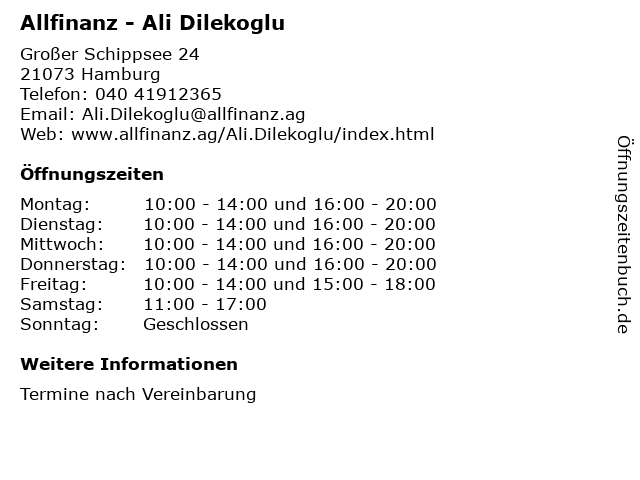 | Öffnungszeiten Allfinanz - Ali Dilekoglu in Hamburg anzeigen | |