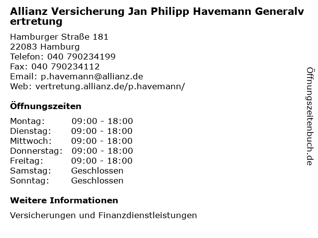 1 Allianz Versicherung Dennis Krüger Generalvertretung (Entfernung: 0,00 km) Hamburger Straße 181, 22083 Hamburg 2 Allianz Versicherung Max von Arnim Generalvertretung (Entfernung: 0,01 km) Hamburger Straße 181, 22083 Hamburg 3 Lohnsteuerhilfe Bayern e.V. ( Jan - April ) (Entfernung: 0,30 km) Hamburger Straße 146, 22083 Hamburg 6 |