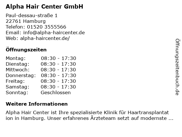 | Öffnungszeiten Alpha Hair Center GmbH in Hamburg anzeigen | |