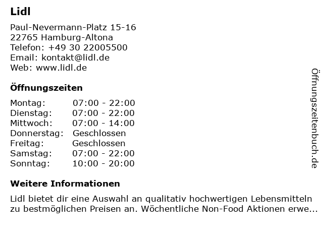 | Öffnungszeiten Lidl in Hamburg-Altona anzeigen | |