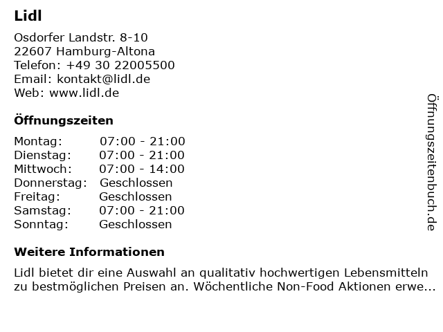 | Öffnungszeiten Lidl in Hamburg-Altona anzeigen | |