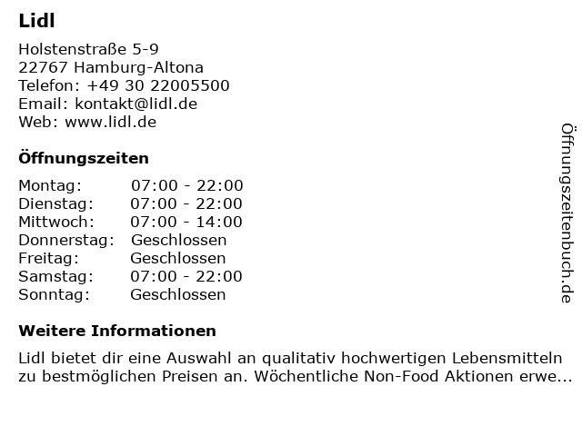 | Öffnungszeiten Lidl in Hamburg-Altona anzeigen | |