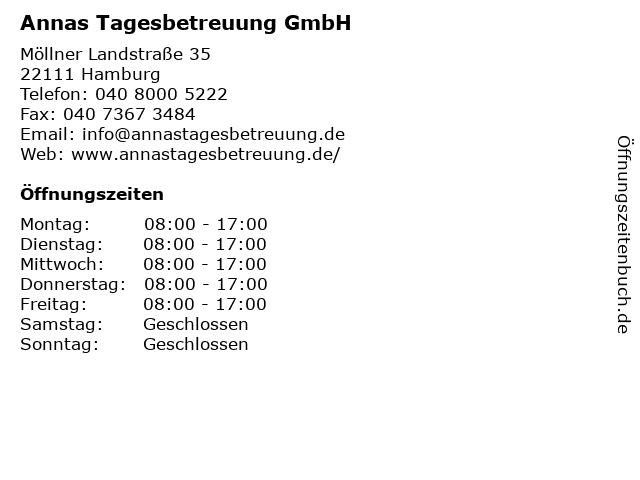 | Öffnungszeiten Annas Tagesbetreuung GmbH in Hamburg anzeigen | |