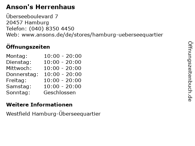Öffnungszeiten Anson's Herrenhaus in Hamburg anzeigen | |