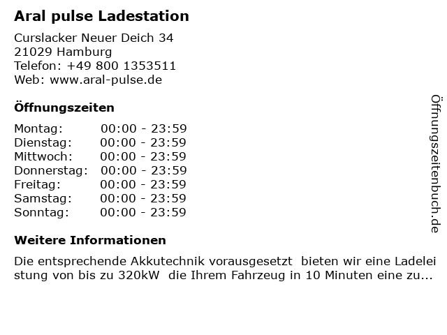 | Öffnungszeiten Aral pulse Ladestation in Hamburg anzeigen | |
