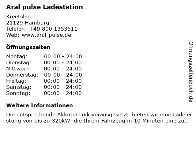 | Öffnungszeiten Aral pulse Ladestation in Hamburg anzeigen | |