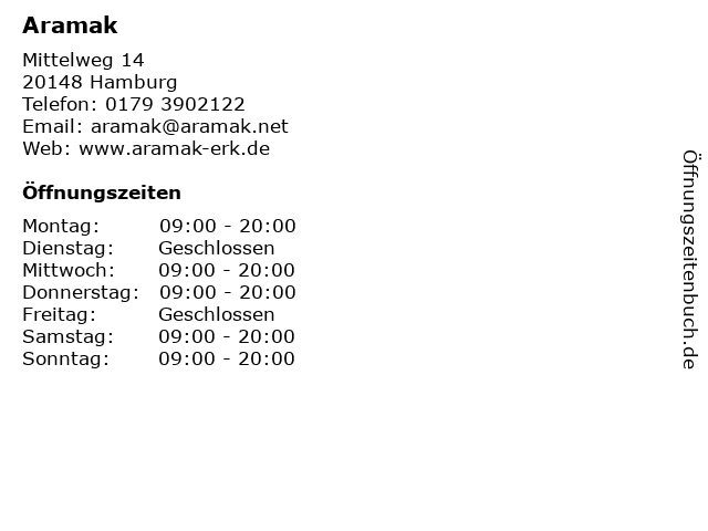 | Öffnungszeiten Aramak in Hamburg anzeigen | |
