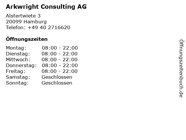 | Öffnungszeiten Arkwright Consulting AG in Hamburg anzeigen | |