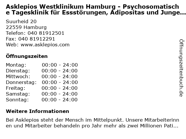 3 Asklepios Westklinikum Hamburg - Psychiatrische Tagesklinik im ZSG Osdorf (Entfernung: 0,00 km) Kroonhorst 11, 22549 Hamburg 5 Asklepios Westklinikum Hamburg - Psychosomatische Tagesklinik Rissen (Entfernung: 0,00 km) Suurheid 20, 22559 Hamburg 6 |